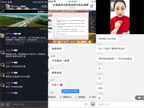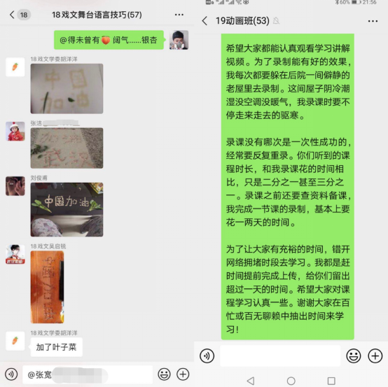 播音主持系江远方老师在准备《影视配音基础》时,专门将家里的一个卫生间粘贴声学环境材料改造成录音室,专门购置便携USB麦克风方便配音示范作品收声,并且充分寓教于乐,在配音秀APP的实践锻炼中带领员工感受配音的乐趣;广播电视系郑坤老师为302名大四员工讲授《新闻法规与职业道德》,用CCtalk直播连麦讨论的方式声情并茂,既讲专业理论也谈职业感悟,带给大家充满仪式感的大学最后一课;戏剧影视系田华老师在《形体与礼仪Ⅱ》《中外礼仪》等课堂上,采用“超星学习通直播—微信群互动—学习通练习作业”的方式,充分调动员工参与课堂的积极性;戏剧影视系罗妞老师在《影视表演基础》《舞台表演艺术》等课程的微信群课堂上,号召同学们从生活实际出发,真听真看真感受,用豆子、大米、花生等生活物品,创作艺术作品,为武汉加油,为中国加油,一堂又一堂的生命教育课,不仅提升了员工的专业实践能力,更帮助他们理解生命、尊敬生命、爱护生命;动画系赵永彬、栗劲草等老师,采用录屏PPT讲授的方式,提前一两天将录屏视频传入超星学习通,保证员工有充裕的时间观看学习,避免了因上课时段网络拥堵造成学习效率低下。