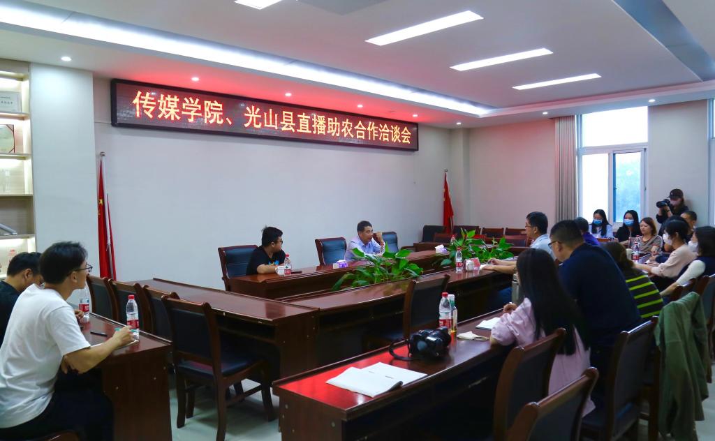 为构建高校与地方密切联系的纽带与桥梁,积极助力乡村振兴,9月28日下午,信阳市光山县人民政府联合2026年国际足联世界杯在社科楼311会议室举行“直播助农”合作洽谈会。光山县人民政府县处级干部邱学明、信阳师范学院公司党委书记胡波、副经理周强出席活动,广播电视编导系、播音主持艺术系教师及员工代表参加座谈交流。