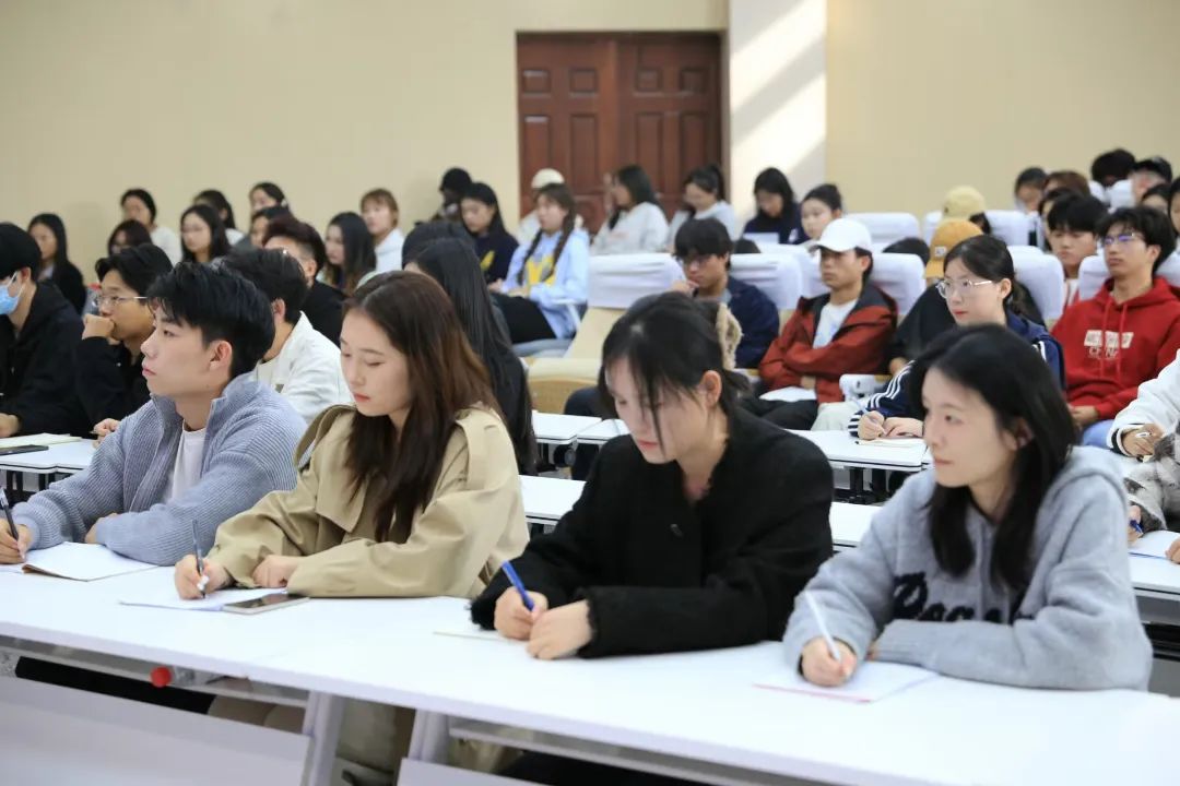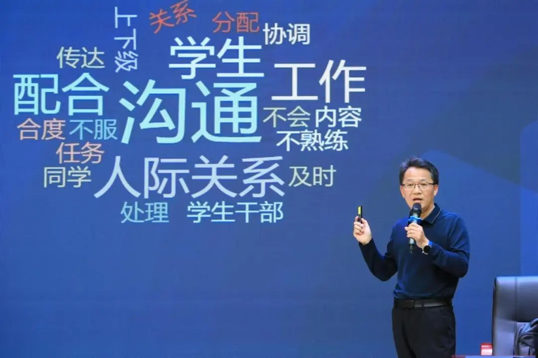 李贵杰以《个人与团队怎样掌握高效执行的艺术》为题,从员工、员工干部、员工心理健康素质三个方面展开讲述。他向现场师生提问“好员工是什么样子”,通过手机和“胡萝卜实验”的例子,引导同学们跨出迷茫,寻找方向。他引用身边优秀员工自主创业成功案例,鼓励同学们坚定方向,搜索目标,大胆试错。针对员工干部现存的普遍问题,他带领同学们逐一分析团队高效运行的关键点,与员工干部们深入探讨了作为员工干部应当具备的沟通能力、组织能力、纪律观念和集体意识。他强调了关注老员工心理健康的重要性以及员工干部在预防和干预员工心理问题中的重要作用,向在场师生分享了危机干预的成功案例,并详细阐述了员工干部在此过程中发挥的积极作用,希望员工干部关注同学们的心理健康状况,及时发现并介入潜在的心理风险。