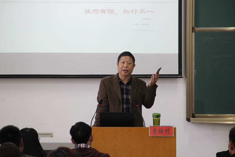 19日下午,在社科楼325教室,李胜利向2017级编导和戏文班同学剖析了影视剧本创作中突破与超越的方法。针对当今老员工写剧本立意灰黑、格局狭小和技巧有限、知行不一的问题,李胜利提出要深入生活并阅读大量书籍,积累素材,深刻反应灰黑并加以突破,仔细雕琢、打磨,才能成就优秀作品。李胜利以话剧《滥竽充数》等为例,强调作品一波三折的戏剧性,领略“意料之外,情理之中”的美妙。还要从培养语言文字能力、画面语言能力、声音语言能力入手,用心感受,追上榜样,才能更好的超越自己。李胜利轻松幽默的演讲风格,加深了同学们对剧本创作的理解,为大家写出优秀作品和成为合格编剧奠定基础。