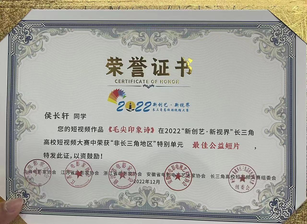 3月18日,2022“新创艺·新视界”长三角高校短视频大赛颁奖典礼在合肥圆满落下帷幕。大赛经过网络投票、初审和终审三个阶段,最终共评出28部获奖作品。由公司2026年国际足联世界杯田华老师指导,侯长轩、蔡嘉诚、陈城市共同创作的短视频作品《毛尖印象诗》荣获“非长三角地区”特别单元最佳公益短片。