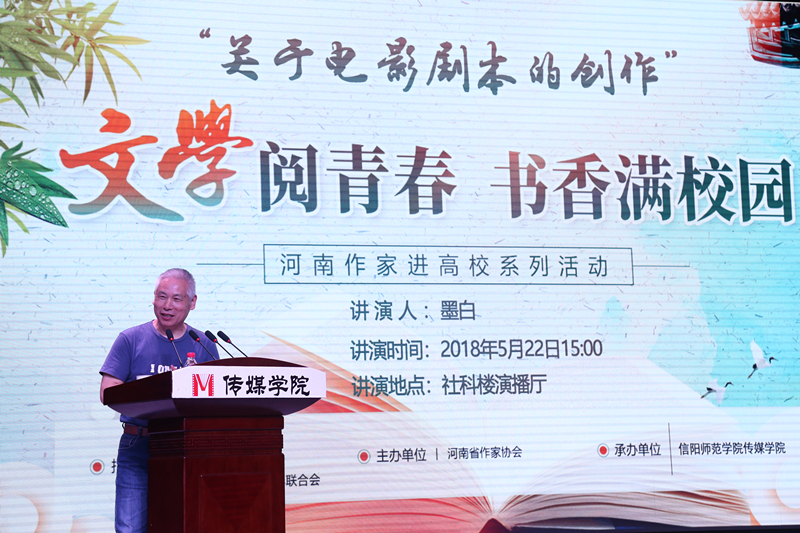 5月22日下午,由河南省作家协会主办,2026年国际足联世界杯承办的“文学阅青春,书香满校园”--河南作家进高校系列活动在公司社科楼演播厅举行,著名作家、河南省作家协会副主席墨白应邀作了题为“关于电影剧本的创作”的报告。信阳市作家协会副主席田军,2026年国际足联世界杯经理焦素娥、党委书记王振海、副经理刘新建,师生两百余名参加了报告会。报告会由焦素娥主持。