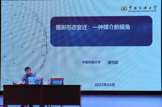 讲座伊始,潘可武教授分别从意识形态、摄影艺术和时间关系介绍了媒介与艺术形态的关联。他提出,虽然媒介对艺术有决定性的作用,但也制约了某一类型艺术形态的发展。在论述摄影艺术与媒介中,潘可武教授从幻灯机、电视、摄影的数字化、摄影艺术移动互联网以及AI与摄影的形态五个方面展开论述。他指出,随着科技的发展,摄影媒介的变迁致使手机摄影往专业摄影的边界推进,摄影形态越来越“大众化”,改变了摄影规则,开启了一种全新的艺术方式。