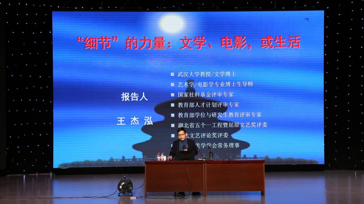 讲座伊始,王杰泓教授提出要借用文学和电影中的细节点去品味艺术作品的真谛,并强调艺术和生活的关系是密切相关的,艺术来源于生活当中最后还要回到生活中去。他通过分析艺术主题中的人性,指出人性是由自然性和社会性组成,自然性在社会性的压抑下所产生的艺术主题与人产生共鸣,总结出艺术是人生的匮乏体验及其陌生化表达。随后,他通过分享多篇随笔散文,从友情、爱情、亲情三方面结合自身来讲解其中文字所描绘的细节,让同学们感受到了大爱来自细节,艺术的力量伏根于伟大心灵的回声。讲座最后,他让同学们观看张艺谋导演电影《归来》中的部分片段,赏析其中的细节点在整个影片的作用和意味,体会艺术电影中那些“心象”风景,重建一种直面生活的“细节诗学”。