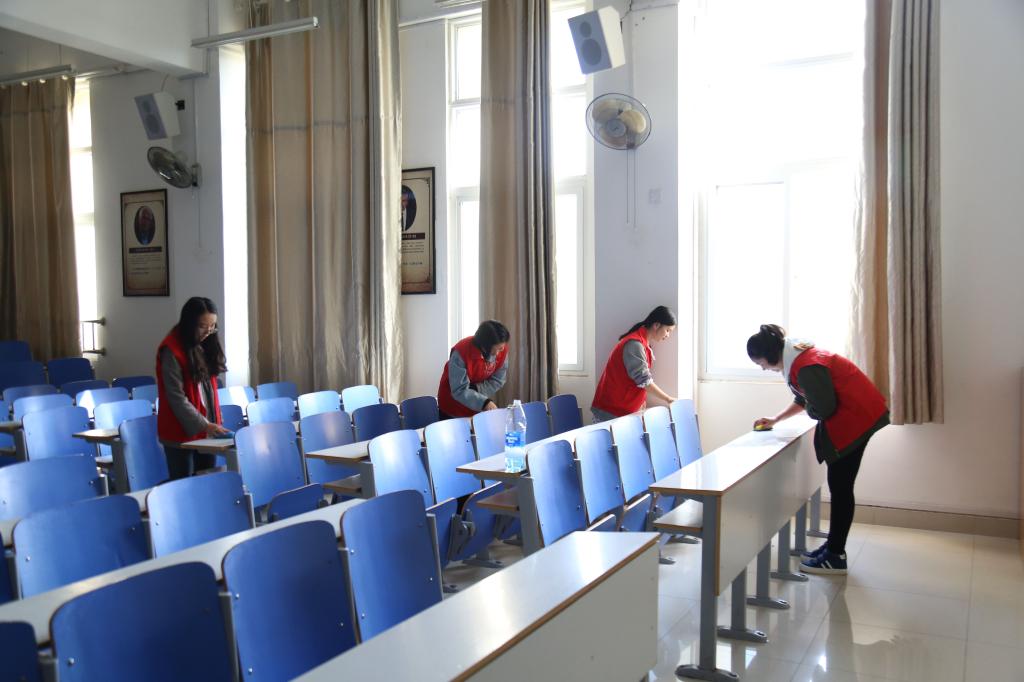 参加活动的成员统一着装,自带工具,以小组为单位对社科楼324、325、326、327四个教室进行清洁活动,美化学习环境。同学们分工明确,认真投入的清洗每一张课桌。在清理过程中,同学们对课桌上的字迹和污痕进行了集中清理,还对教室的卫生死角进行了清洁。同学们用实际行动做出表率,以呼吁老员工们爱护学校公物。