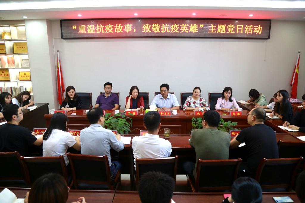 党课以座谈交流的方式进行,6名抗疫英雄为大家分享了他们的故事。中心医院共有397名医护人员参与了新冠肺炎患者救治工作,全体医护人员都是主动请战,没有一个人退缩。90后普通外科护士长李丽两次递交请战书均被退回,但她不死心,在大年初三跑遍信阳市大小超市商店找寻医疗物资和日常生活用品,电瓶车没电了,她就步行,最终自掏腰包筹集了一万余元的物资,通过这种方式支援一线战友,当她最终被批准参加抗疫工作时,她高兴地哭了。呼吸与危重症医学科监护室副主任易浩宇、重症医学科护士长倪荣是冲在抗疫最前线的人,面对信阳市第一例新冠肺炎患者插管工作,医护人员抢着要做这件危险的工作,易浩宇、倪荣说“我俩年纪大,又是党员,今后有这样危险的工作,我俩先上”。芦乙滨作为重症医学科主任,参与到每一例重症新冠肺炎患者的会诊工作,需要连续工作,医院为他专门预订了宾馆,他说如果科室主任都跑了,其他人会怎么想,他一直与科室医护人员住在办公室。第一急诊医学抢救室护士长余敏,为了做好患者的转移工作,提前做好各项准备工作,用瘦小的身躯扛起100多斤的氧气瓶。