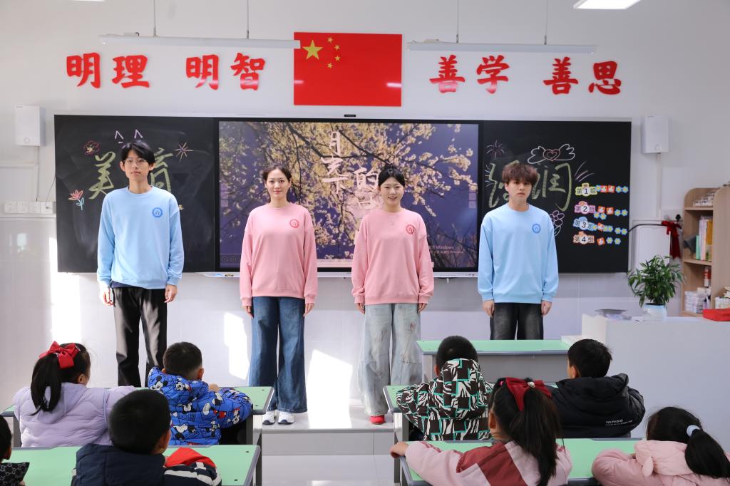 活动最后设置了推广普通话的互动环节,通过趣味讲解与示范朗读,不仅普及了国家通用语言文字的重要性,也深化了美育与德育、智育的融合。此次“美育浸润”实践,充分发挥高校专业优势,推动优质美育资源下沉基础教育一线,让美的种子在孩子们心中悄然生根、茁壮成长。(初审:李诗雨 复审:陈长旭 终审:田华)