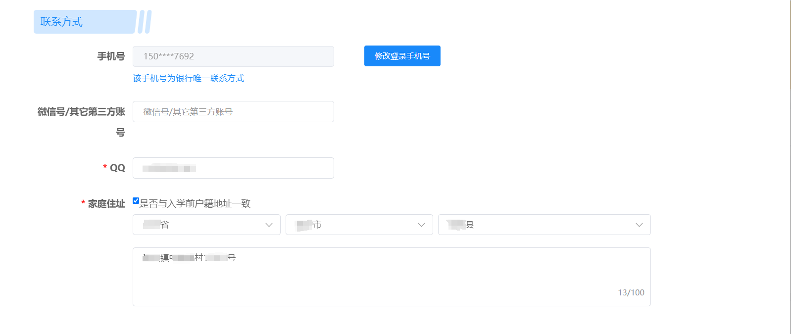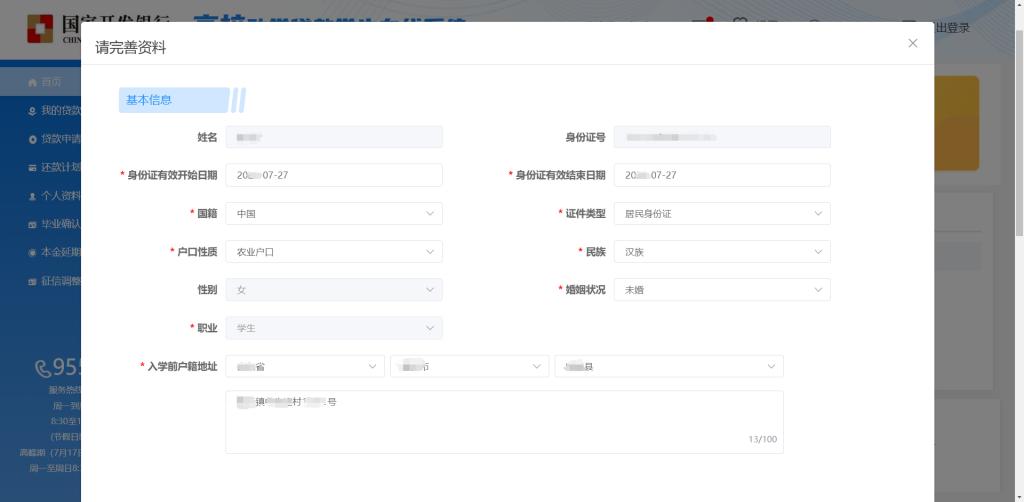 2.完善基本信息,入学前户籍地址填写要求:在村镇居住,省、市、县、乡(镇)、村门牌号等信息要填写完整,每级行政单位不能缺;若在市县居住,要具体到所在区、街道及小区名称楼栋号。