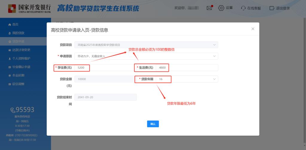 2.确认贷款年度,选择贷款原因,准确填写学住费金额,据实填写生活费金额,两者之和为本年度贷款总金额(须为100的整数倍),贷款年限、贷款结束日期(即贷款到期日期)根据员工所填年级、学制自动生成。如需调整贷款年限,需最少不低于6年(含6年)。