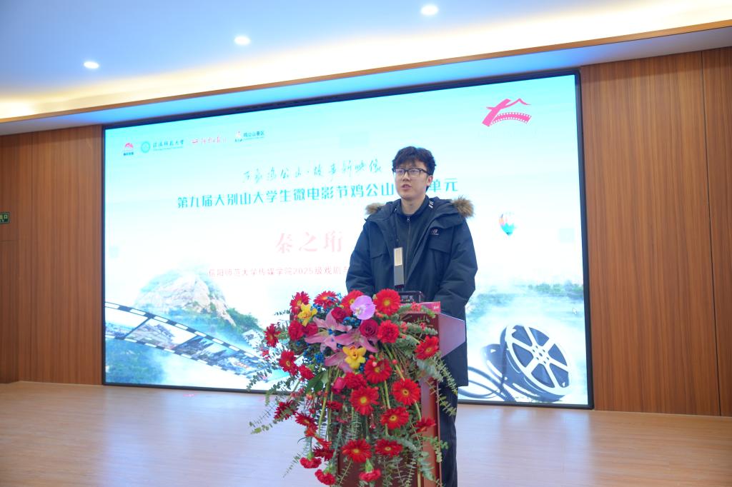 田华首先欢迎各高校师生参与鸡公山限时创作单元,感谢河南日报社和信阳鸡公山风景区经营管理有限公司的支持,然后从技术与视角两个维度阐释了本赛事的双重新意,并期待青年学子以独特视角挖掘鸡公山的自然之秀与人文之魂,创作出既有技术锐度又有人文温度的佳作。