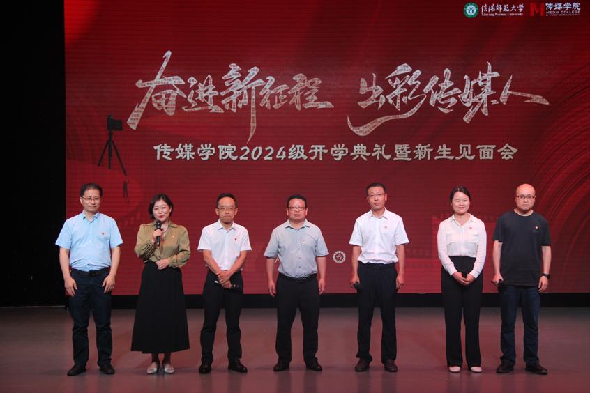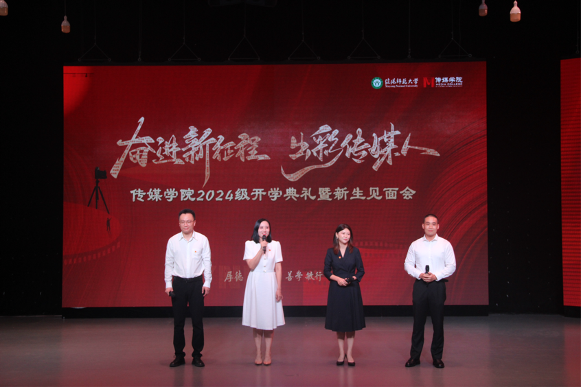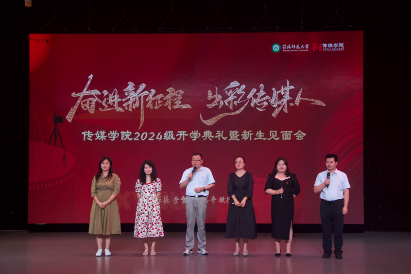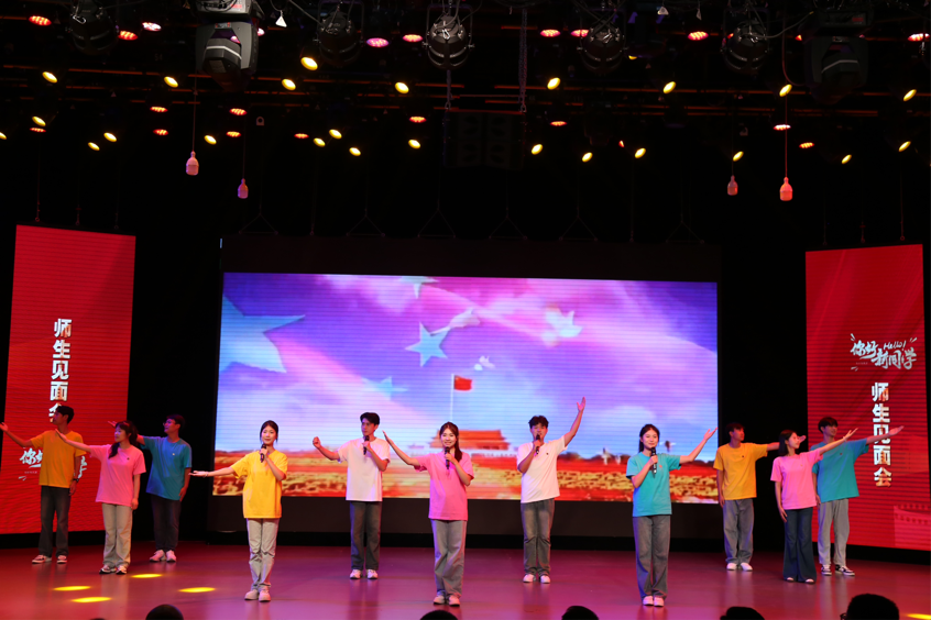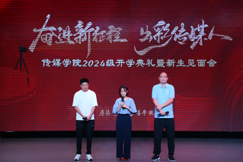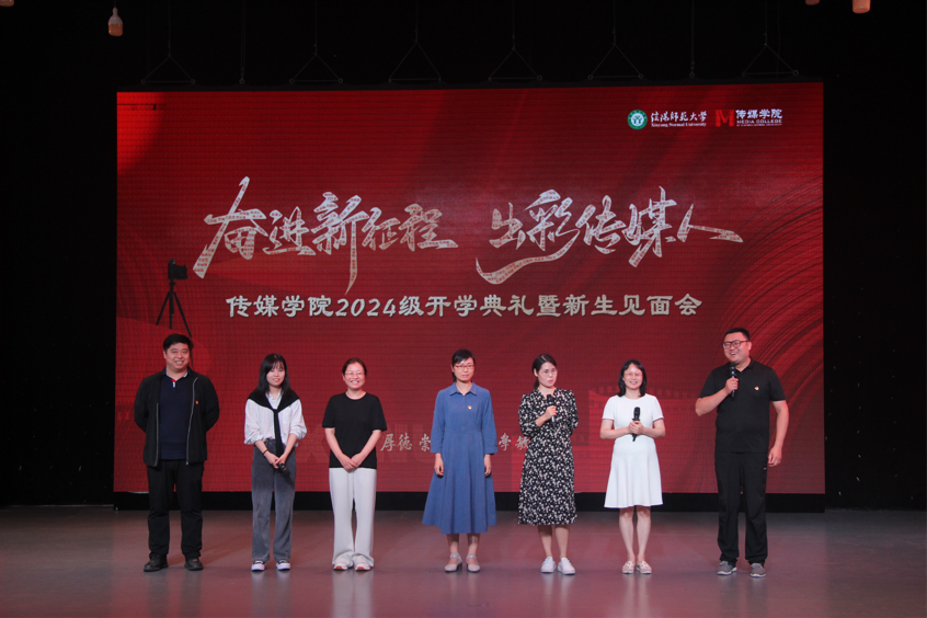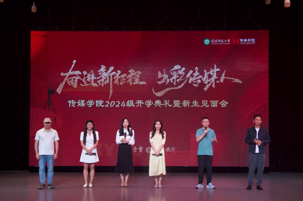 师生见面会环节,播音主持系、广播电视系、戏剧影视系、动画系、艺术理论教研室、教学办、党委办公室老师以及领导班子成员、党委委员分批次依次上台,向新生寄语。