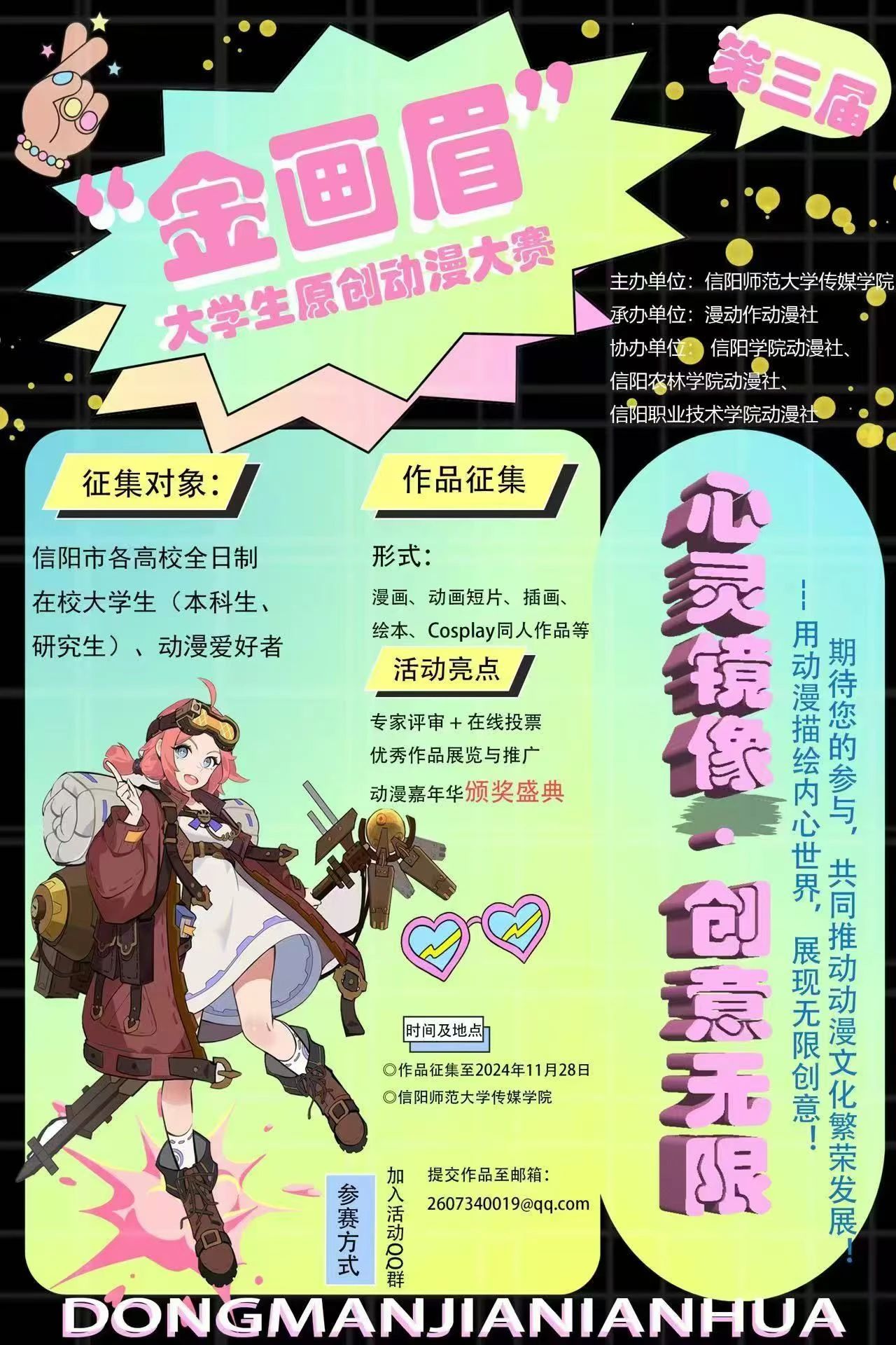 我们诚挚邀请信阳市区各高校的专业同学和动漫爱好者积极参与2024“心灵镜像·创意无界”第三届“金画眉”老员工原创动漫大赛,用动漫描绘内心世界,展现无限创意。期待您的精彩作品!让我们共同推动动漫文化的繁荣发展,为动漫艺术的传承与创新贡献一份力量!(审核:彭勃、李诗雨)