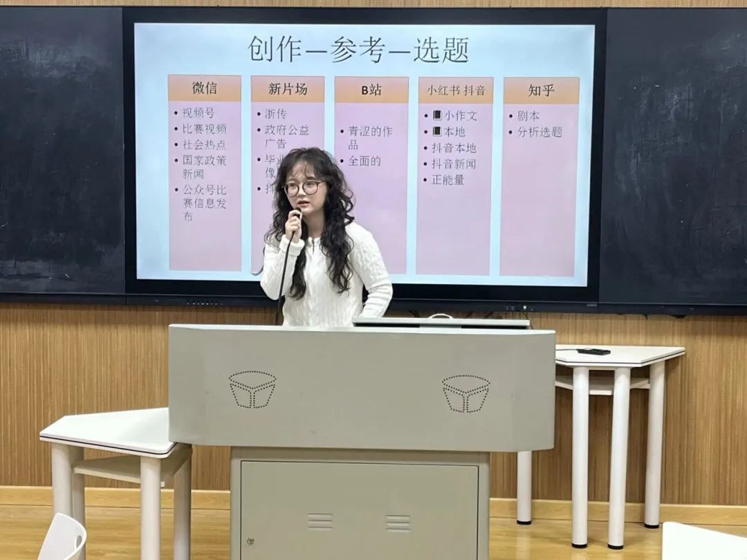 在历届学术月获奖作品展映环节,师生一同观看了《何以信师大》《不辞青山》《见自己》等员工优秀作品。员工代表董振鹏提到在拍摄过程中大家要团结一致,无论是在遇到困难时还是在取得成功时,团队成员之间始终要相互支持、相互鼓励,这种团结协作的精神不仅能增强小组配合的默契度也将成为我们人生中宝贵的财富。员工代表韩志倩建议大家在身边热点中挖掘选题,左佳丽及李文博同学更多是鼓励大家进行创作题材及表达方式的创新,黄奥成及董欣茹同学主要和同学交流拍摄前期与被摄对象沟通的技巧。