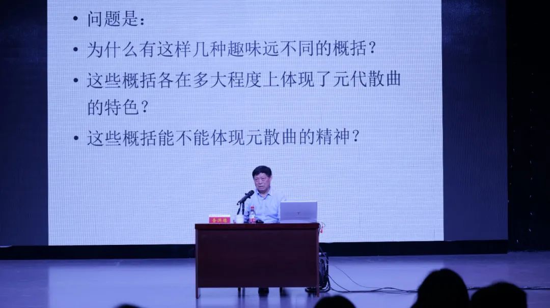 查洪德教授用不同朝代的文学形式引出对元曲的初步认识,指出元曲是中国文学史上的另类,并简单介绍了元曲的三大类,即戏曲、杂剧、散曲。接着他从同学们最为熟悉的《天净沙·秋思》、《山坡羊·潼关怀古》等元曲入手辨析元曲特点:谐、俗、辣、俏。他指出,并非所有的元曲都同时具备这些特点。同时,他向大家提出三个层层递进的专业问题,从而引发师生们的深刻思考。